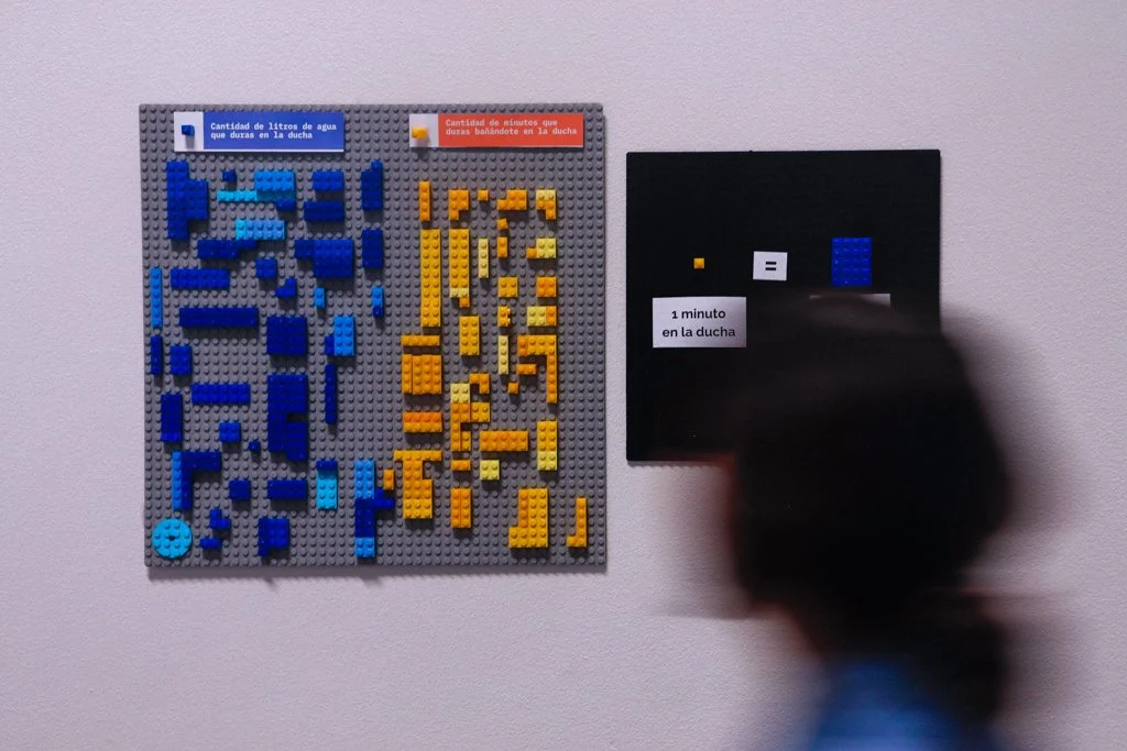 Para hacer visible ese desfase, construimos un dispositivo con fichas de LEGO: cada punto amarillo representa un minuto en la ducha y cada punto azul, un litro de agua. Así se vuelve tangible la distancia entre percepción y realidad.