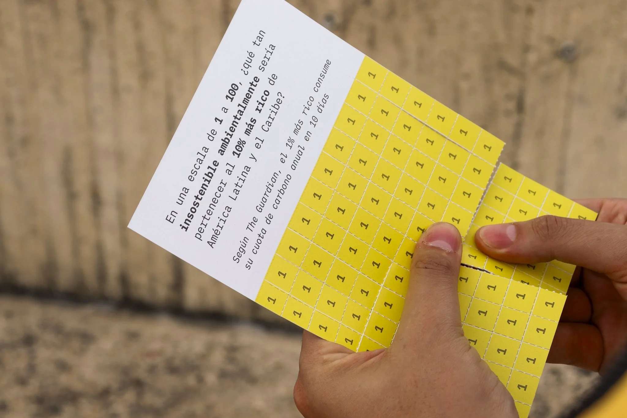 Las y los participantes tomaban una tarjeta y respondían una pregunta aparentemente aislada: ¿En una escala de 1 a 100 qué tan insostenible ambientalmente sería pertenecer al 10% más rico del mundo?