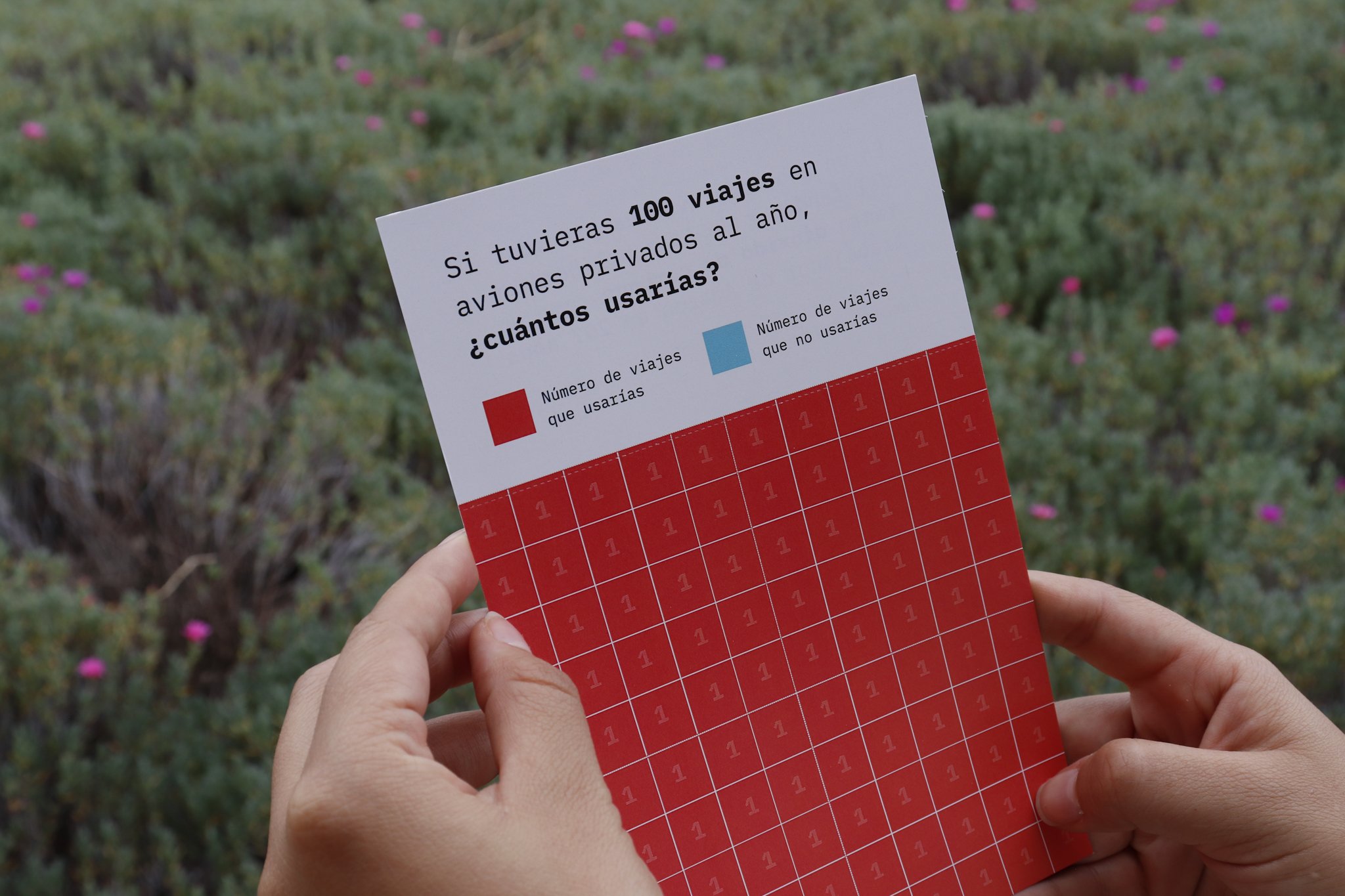 Después de responder, las y los participantes descubrían el dato del reverso: en un año, dos aviones privados del fundador de Amazon liberaron tanto dióxido de carbono como un trabajador de la misma empresa en 207 años, según Oxfam. La respuesta individual quedaba inmediatamente situada dentro de una escala real de desigualdad climática.