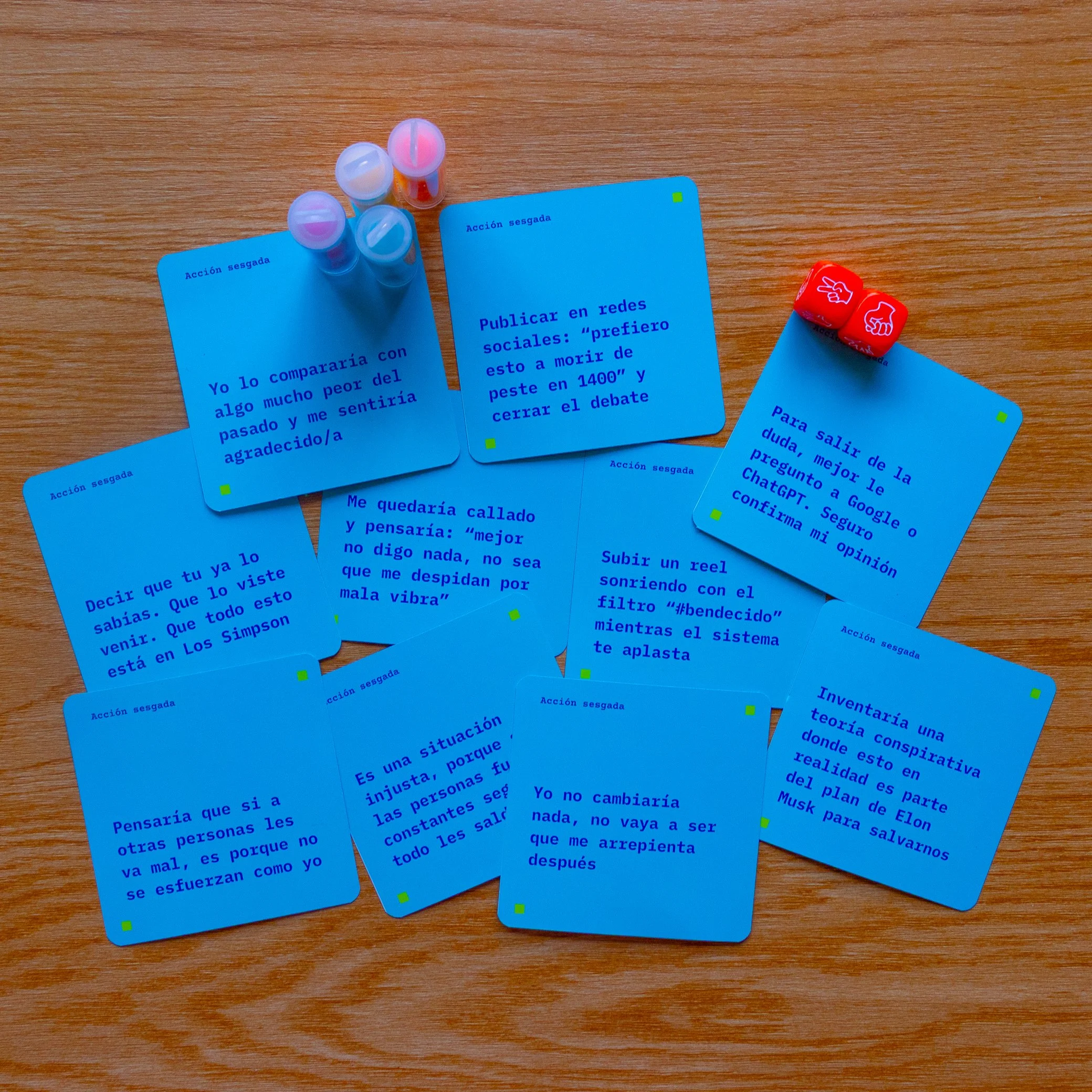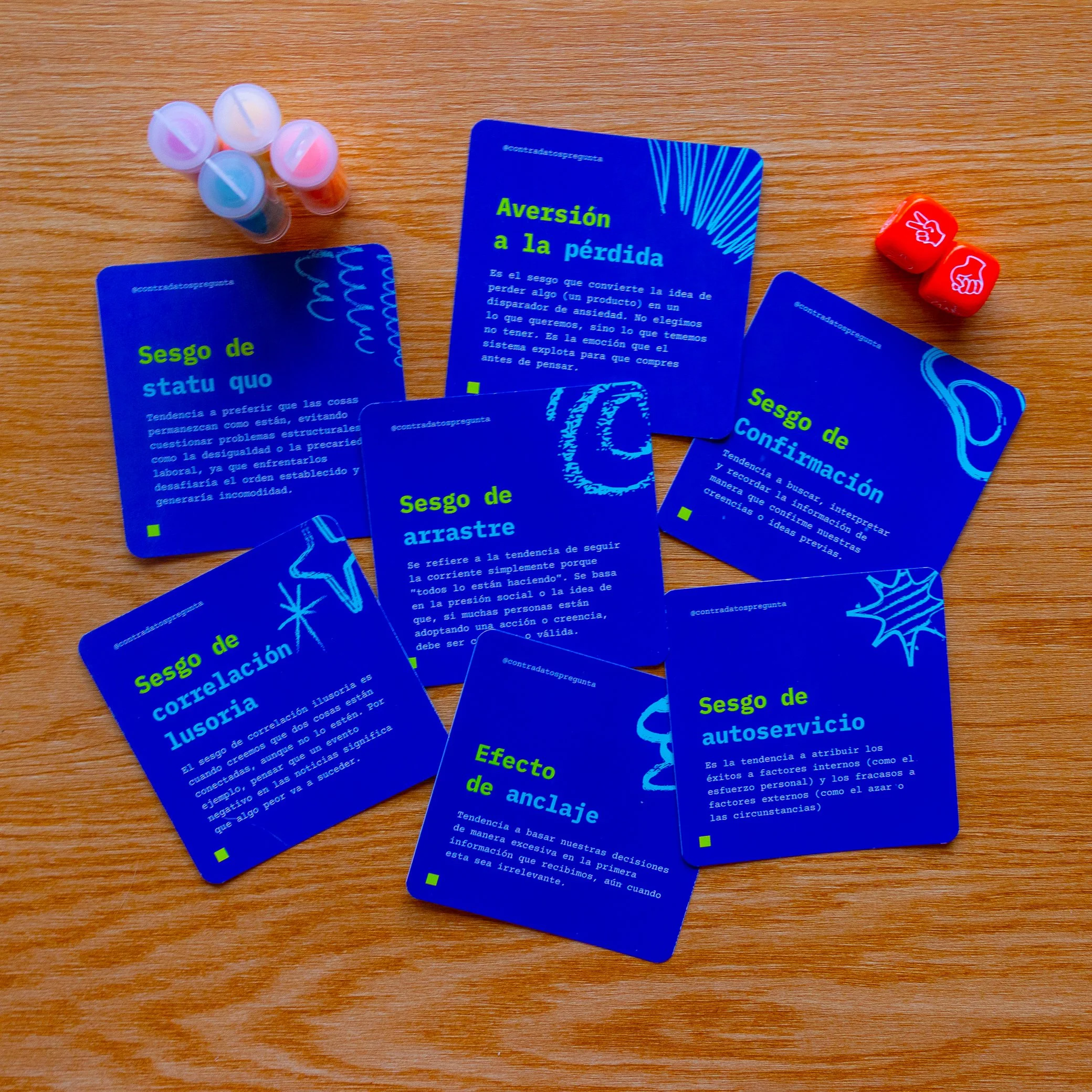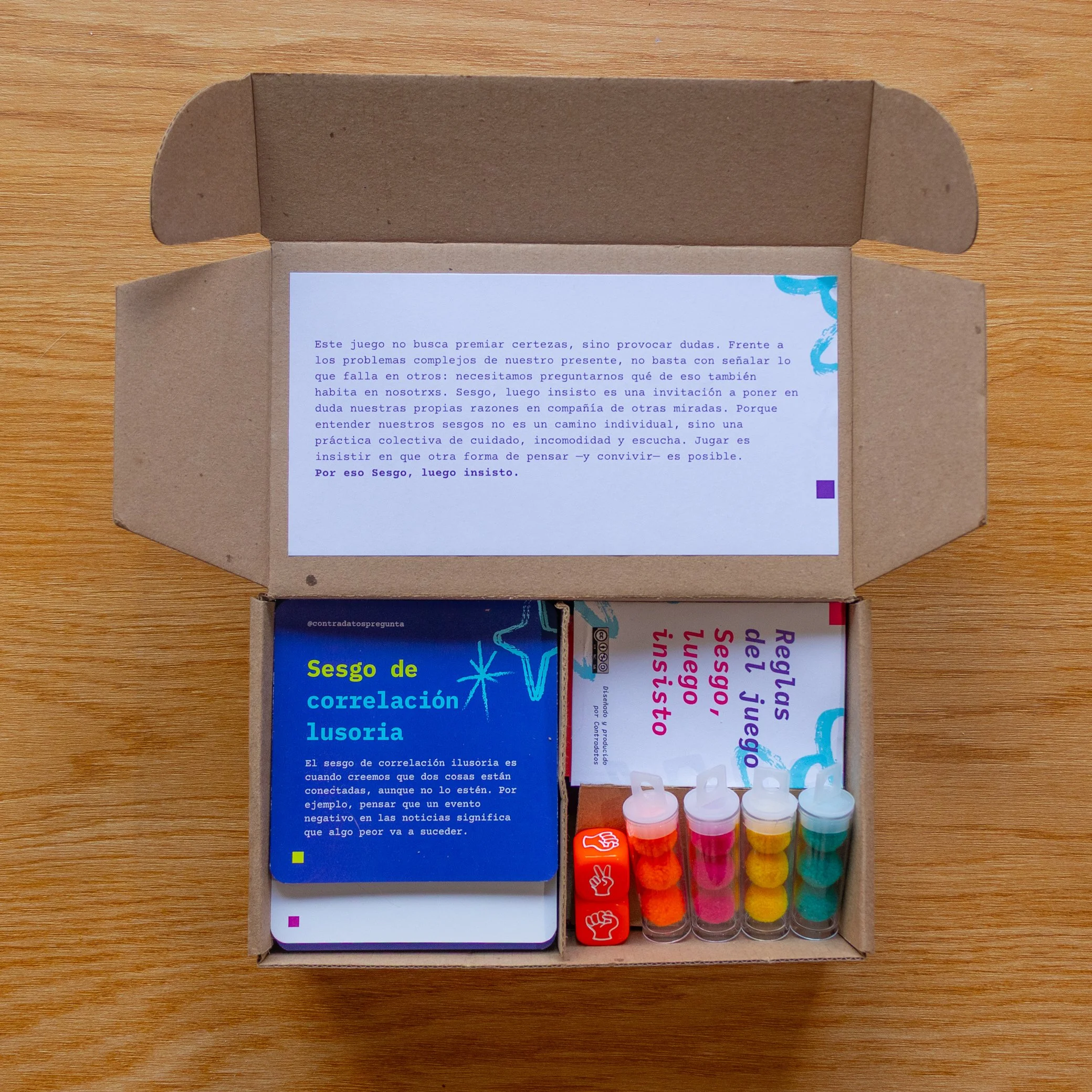 “Sesgo, luego insisto” es el segundo prototipo de juego de Contradatos. Lo hemos ido construyendo entre pruebas, conversaciones, desacuerdos y carcajadas. Es un juego para mentes abiertas… hasta que alguien las contradice. Porque ahí, justo en ese momento incómodo, empieza lo interesante.