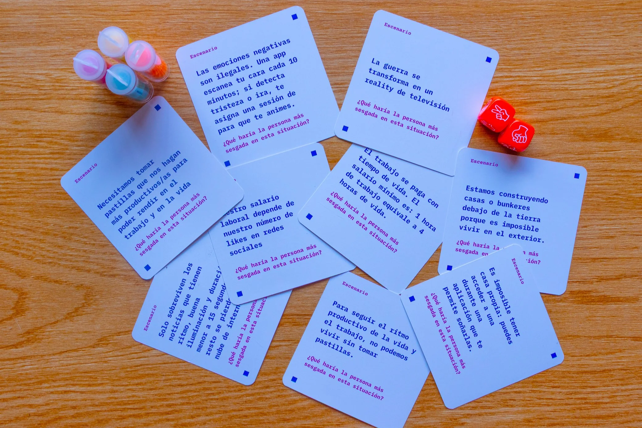 El juego se estructura en torno a situaciones límite o cotidianas, pero llevadas al extremo. Imaginate una app que castiga tu “tono emocional”, un juicio en vivo donde el público decide con emojis, o un trabajo donde cada hora se descuenta de tu vida. Frente a esos escenarios, cada jugador o jugadora elige una carta de su mano: la reacción más sesgada posible. Algunas cartas dicen cosas como: