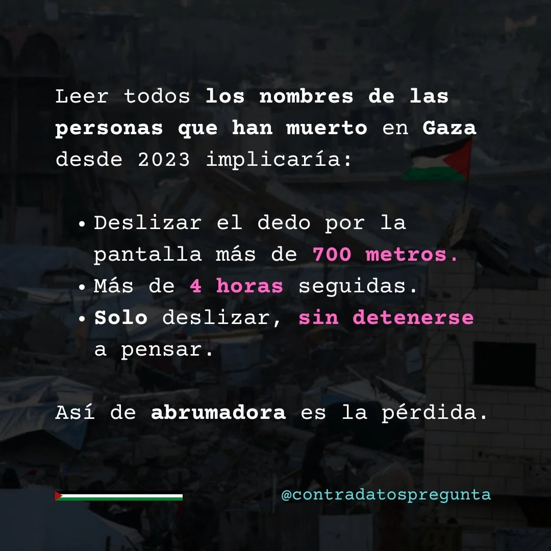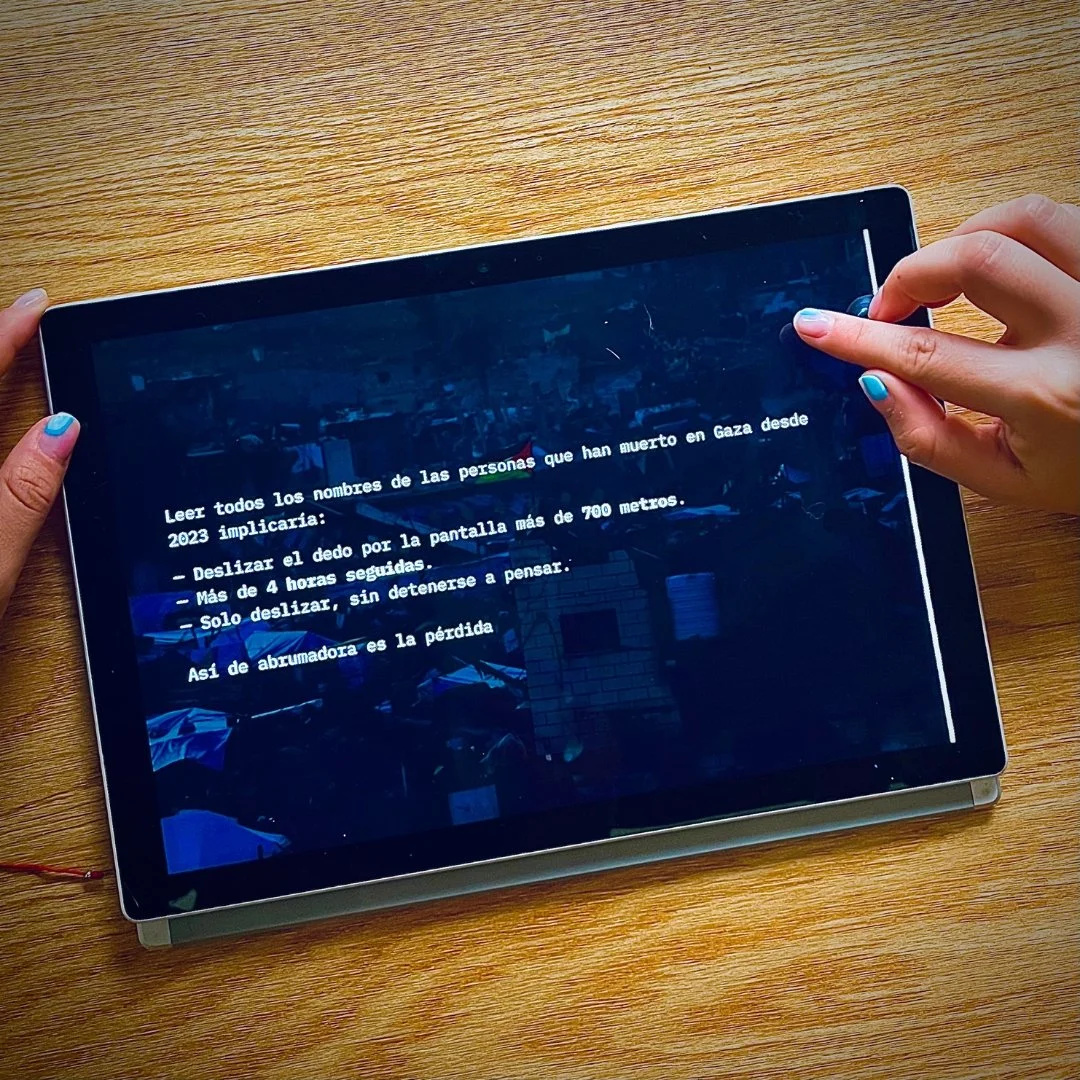 Leer todos los nombres de las personas que han muerto en Gaza desde 2023 implicaría deslizar el dedo por la pantalla más de 700 metros. Serían más de cuatro horas seguidas de recorrido ininterrumpido. Solo deslizar, sin detenerse a pensar.
